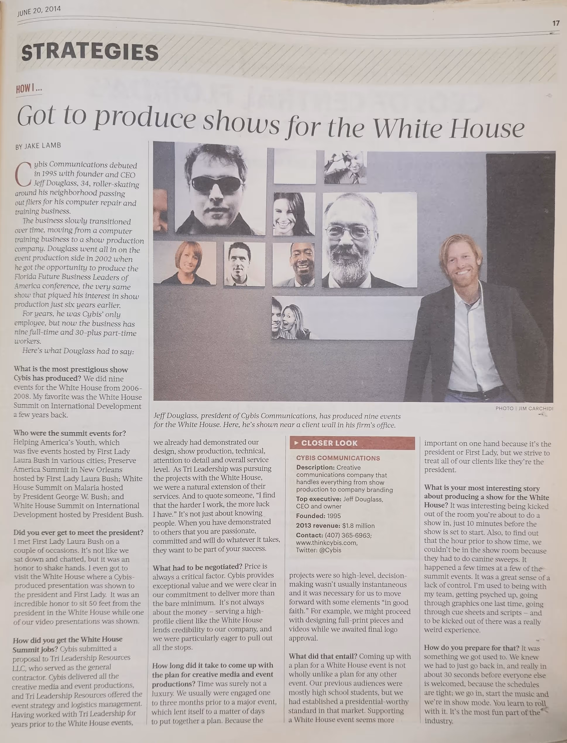 We got a call from the folks producing a White House event—this was a few years back—but they came up with this event concept for the president. And I got the call on Thanksgiving weekend, and the event was two and a half weeks later. We branded it, came up with the creative design, set design, brought out a team, the gear in three weeks. And of course you pull out all the stops when it's the White House and the President was on stage. So we can do it fast, but it's a little trickier. It's not—I don't want to do that every week.