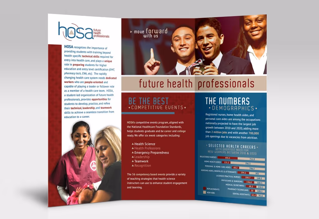 After careful thought and bold decision-making, Cybis designed a natural evolution of HOSA’s preceding brand, incorporating a simplified version of the traditional emblem into a crisp new color palette. The fresh new look was compiled using modernized type and color that couldn’t be found in the original 1976 design. The triangular emblem is still the focal point of the design, representing the three aspects of humankind’s well-being, but it was now paired with a new tagline and inventive identity.