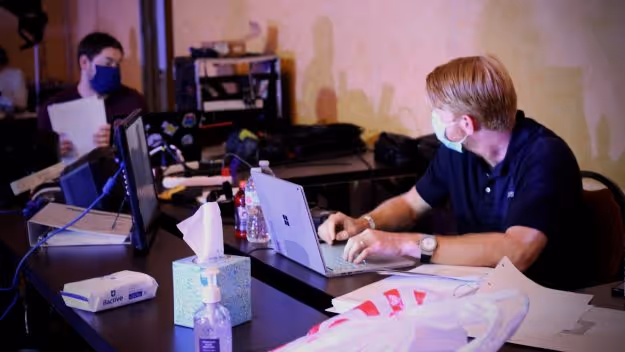 This year, the Cybis Team flew to Dallas, TX to produce and broadcast the general sessions for HOSA’s online audience of over 6,000. Tucked away in a ballroom of the Gaylord Texan Resort & Convention Center, our team built a full set equipped with an LED screen, neon accents, a brilliant reflective stage, full lighting, and haze for dramatic effect. The leadership rehearsed and presented on-stage as normal… with the contingencies of wearing masks and staying 6’ apart.