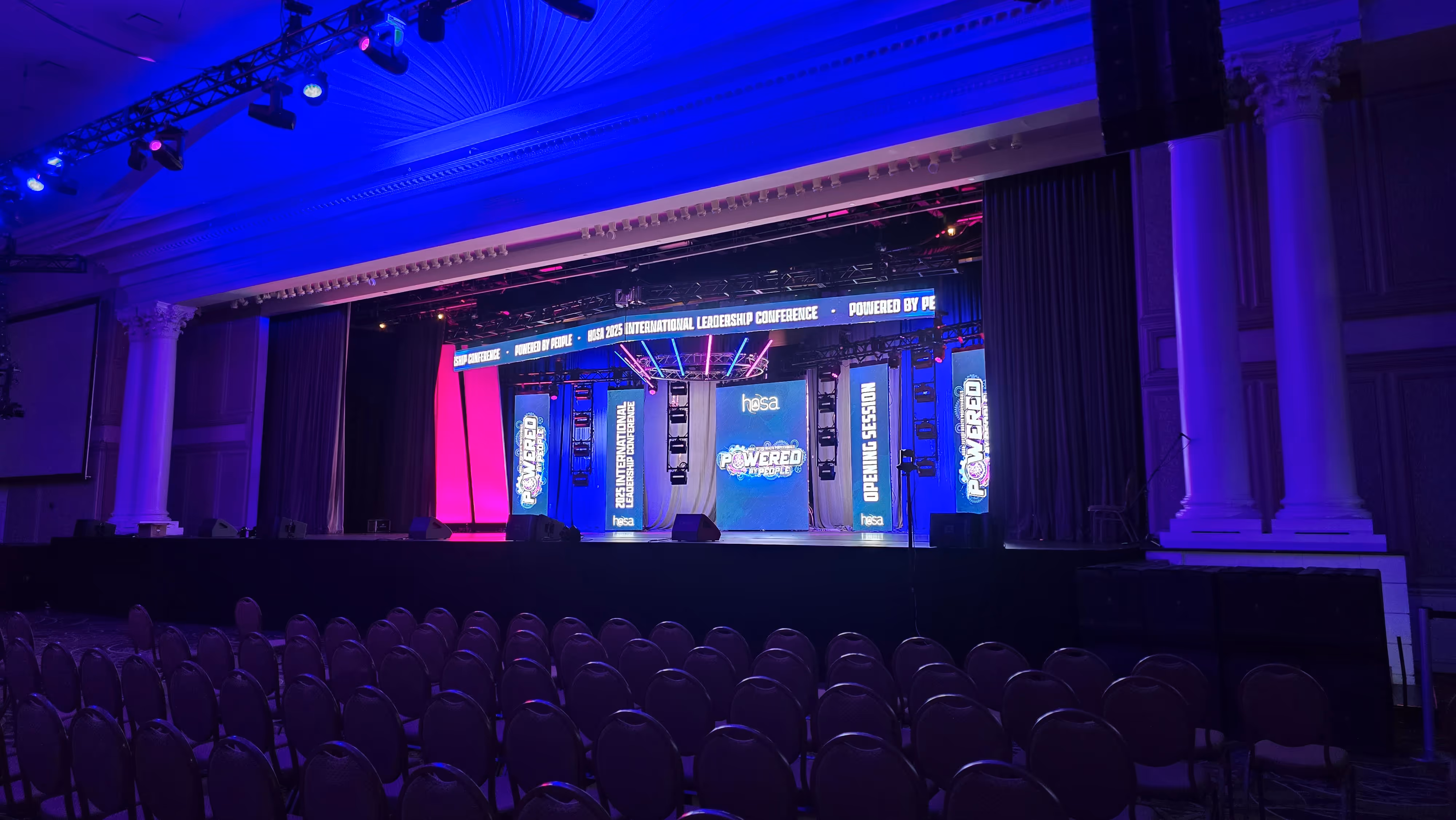 Beyond launching the show, the video set the tone: it was inspirational, visually unified, and anchored HOSA’s identity for the entire conference. The video wasn’t limited to any one screen. It was synced across five LED walls and two projection screens, with light towers, LED bars, and circular beams to build the look of the reactor. Attendees and leadership were moved by how the intro video communicated purpose and promise—reinforced through strategic staging and immersive design.
